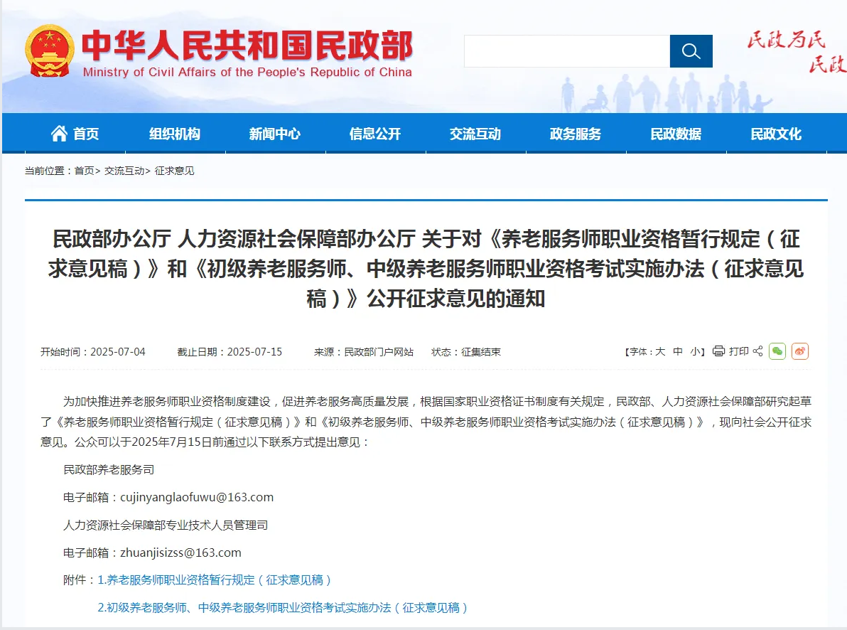 征求意见稿表示,初级养老服务师、中级养老服务师考试原则上每年组织一次。