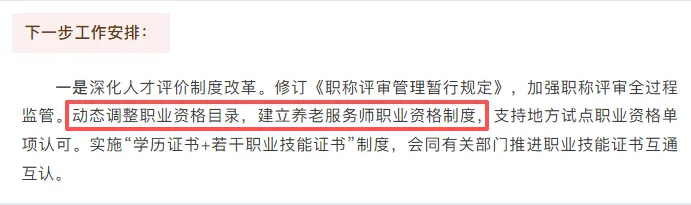 人社部的一则消息给出答案。近日,人社部官号发文明确:动态调整职业资格目录,建立养老服务师职业资格制度。