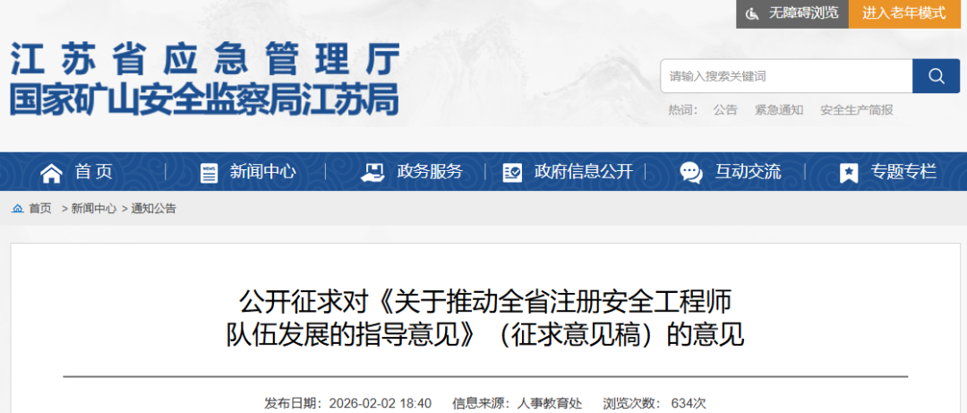 2月2日,江苏省省应急管理厅组织起草了《关于推动全省注册安全工程师队伍发展的指导意见》(征求意见稿),是江苏省落实国家安全生产人才战略的重要举措。