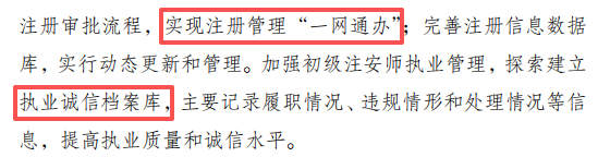 注册管理:建立初级注安师注册制度,实现注册“一网通办”,完善注册信息动态数据库。