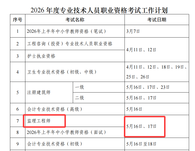 2026年注册监理工程师考试时间发布,定于5月16日、17日。