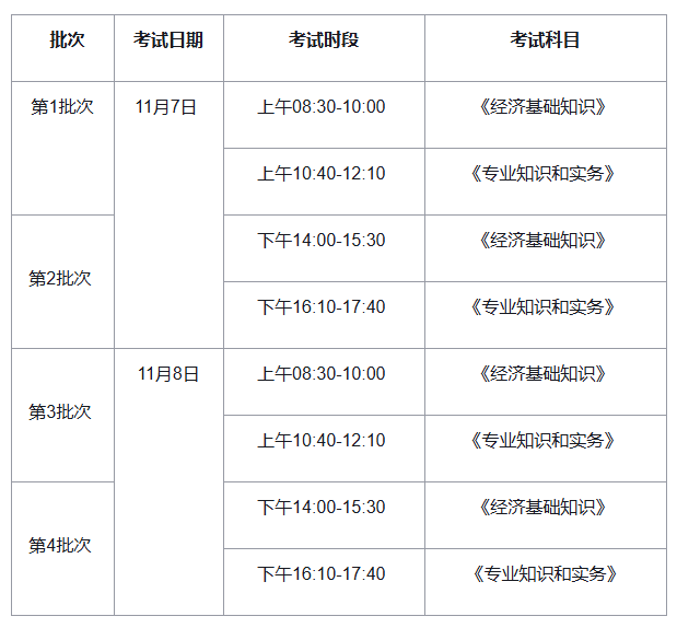 2026年考试时间为11月7日—8日(周六、周日),全国统一。共设4个批次,考生具体场次以准考证为准。每科考试时长90分钟,同批次内先考《经济基础知识》,间隔40分钟后考《专业知识与实务》,两科须同日完成。