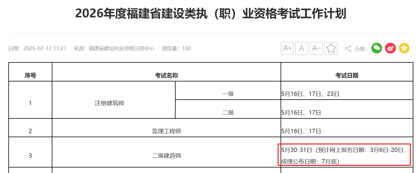 其中,福建省公布2026年二建考试网报时间:3月6日-3月20日(预计)。