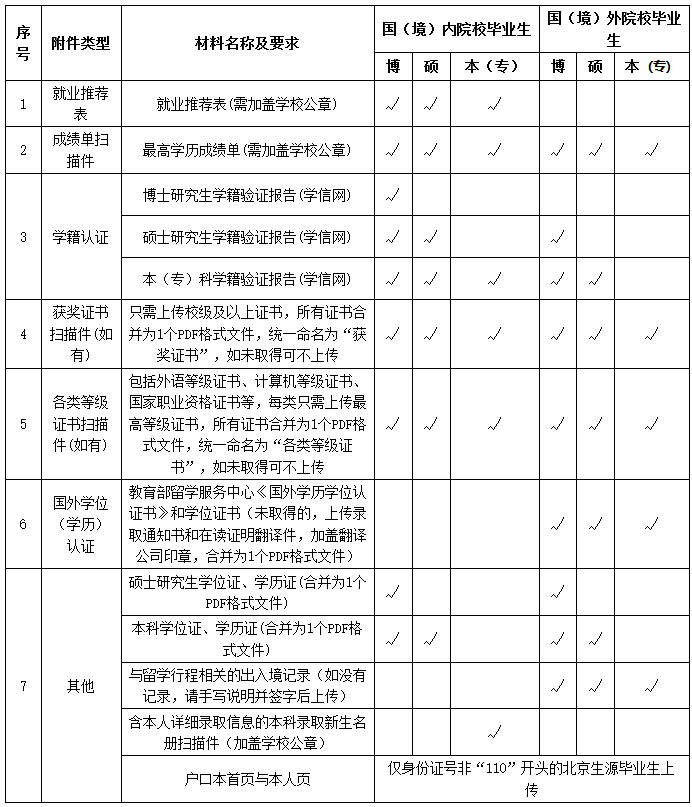 (1)国(境)内院校毕业生:须上传《教育部学籍在线验证报告》(学信网)、加盖学校公章的就业推荐表和成绩单等;本科生还需上传含本人详细录取信息的本科录取新生名册扫描件(加盖学校公章);研究生还需上传本人本科主修专业的毕业证和学位证扫描件。