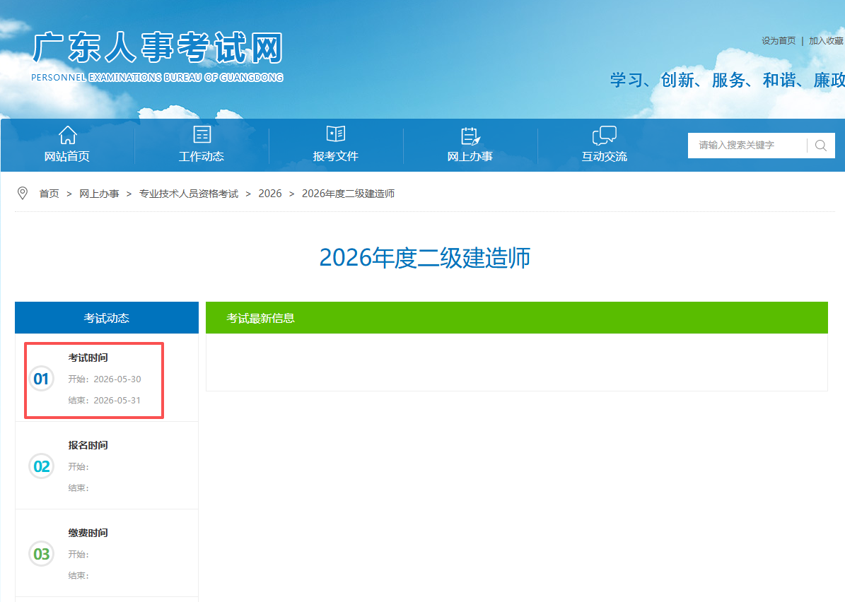 近日,广东人事考试网更新了2026年度专业技术人员资格考试日历,官宣2026年广东二建考试定于5月30日、31日。