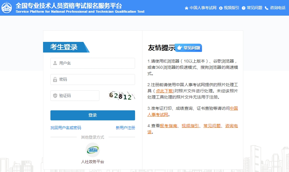中国人事考试网(http://zg.cpta.com.cn/examfront/login/initLogin.htm)。