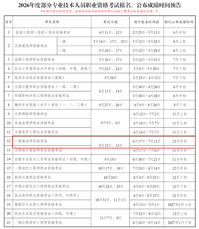 近日,中国人事考试网发布《2026年度专业技术人员职业资格考试重要提示》,公布了26年一级建造师报名时间,一起往下看!