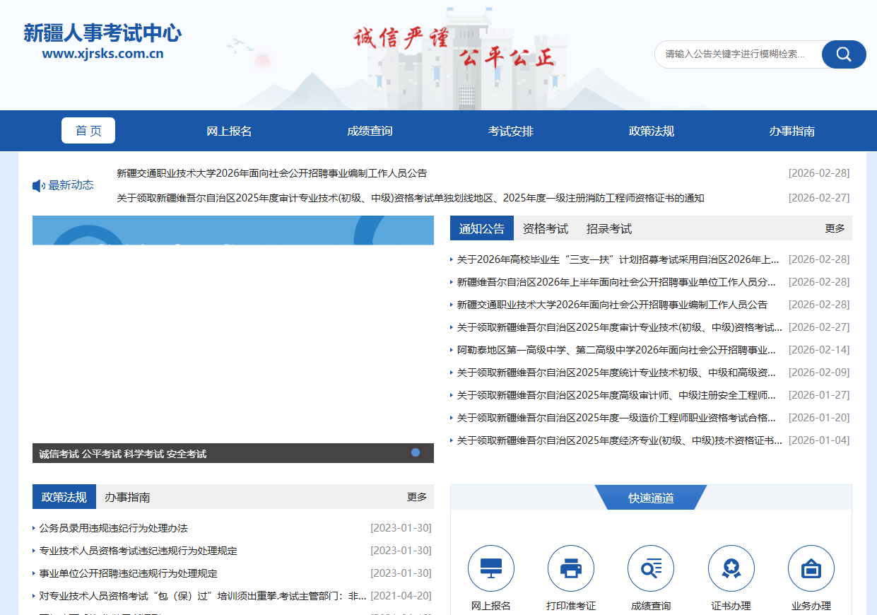 报名采取网络报名的方式进行,报名入口为新疆人事考试中心官方网站(https://www.xjrsks.com.cn),这是本次考试唯一的官方报名平台。考生进入网站后,点击首页的"网上报名"栏目,选择"2026年上半年事业单位公开招聘分类考试"即可进入报名系统。