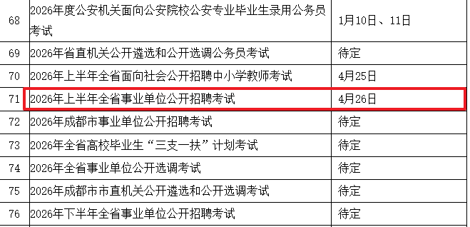刚刚,官方发布消息,2026年上半年四川事业单位考试已确定于4月26日举行。综合岗笔试科目为《公共基础知识》和《综合能力测试》,教师岗考《教育公共基础》,医疗岗考《卫生公共基础》。报名时间预计在3月中旬,持续约7天。下面匠人教育就带大家详细了解一下相关内容!