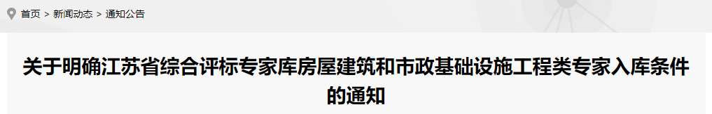 近日,江苏省住建厅发布《关于明确江苏省综合评标专家库房屋建筑和市政基础设施工程类专家入库条件的通知》,明确全省综合评标专家库专家入库新标准,自3月14日起施行,有效期5年。