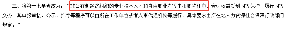 非公有制经济组织的专业技术人才和自由职业者等申报职称评审,合法权益受到同等保护,履行同等义务,其申报审核、公示、推荐等程序可以由所在工作单位或者人事代理机构等履行。