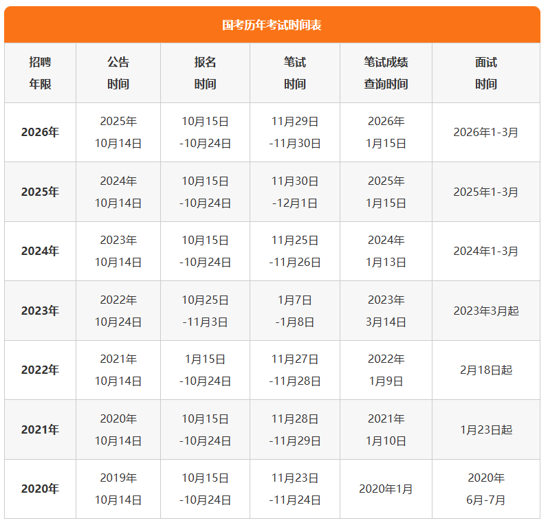 国考时间安排已形成固定规律,近五年公告都在10月14日发布,以下是近几年国考的时间安排,大家可作参考: