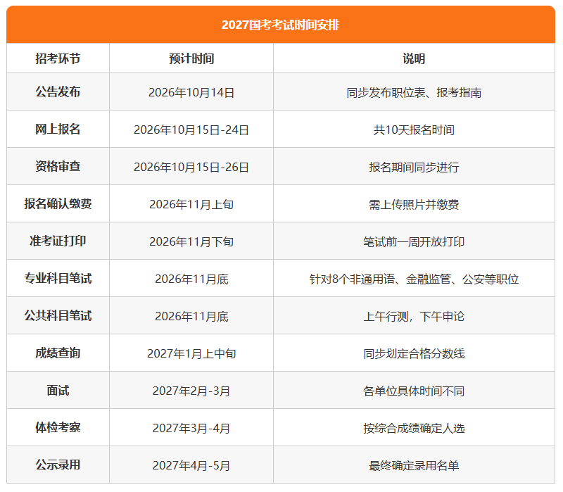 国考的时间安排具有高度稳定性,近五年公告都在10月14日发布,已形成固定规律。根据历年招考安排,2027年国考时间预测如下: