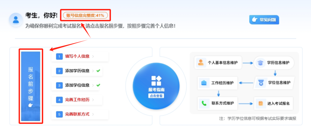 从2024年起,报名相关考试之前需要——填写个人信息、添加学历信息、添加学位信息、完善工作经历、完善联系方式。待「账号信息完整度」为100%时才可以进入考试报名系统。