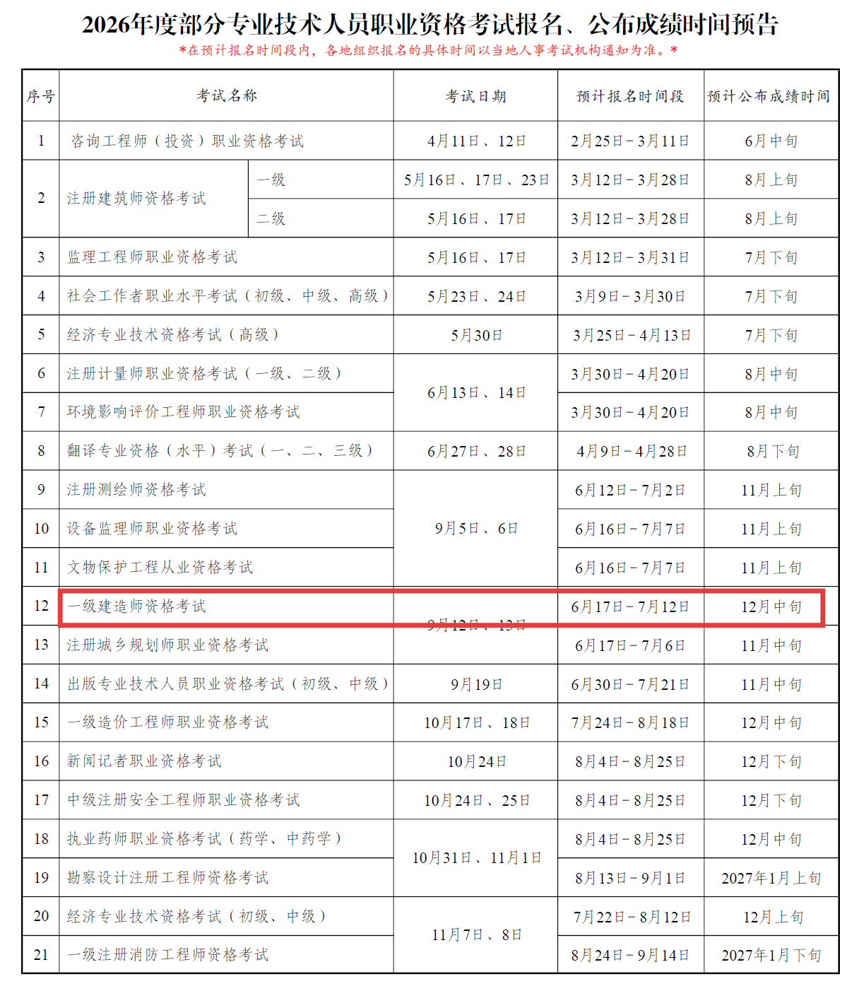 中国人事考试网发布《2026年度专业技术人员职业资格考试重要事项提示》,明确2026年度一级建造师考试报名入口,预计6月17日正式开启!