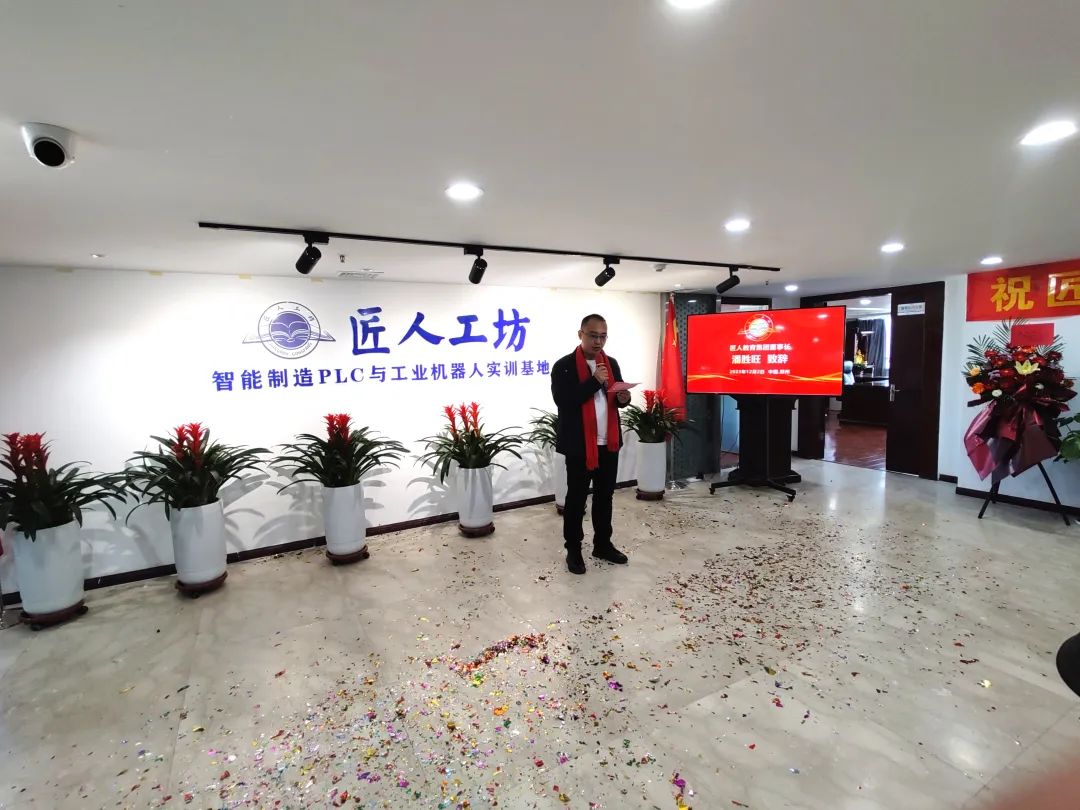 仪式上,匠人集团董事长潘胜旺对出席仪式的领导及嘉宾表达了深深的感谢之情,他表示,匠人工坊的成功运营,离不开各位领导和嘉宾的鼎力支持与悉心指导,并介绍了匠人工坊从筹划到建成开业的心路历程。匠人工坊教学面积2000多平方米,拥有专兼职教师80余人,投资数千万购入大量的先进教学设备,配套设施齐全,专注于智能制造PLC和工业机器人培训。同时也表示,希望各位领导和嘉宾能够一如既往地关心和支持匠人工坊的发展,共同见证匠人工坊的辉煌未来。