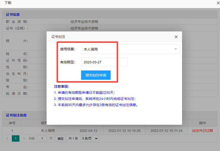证书信息检查无误后,点击【申请证书加注】按钮,进入证书加注页面,选择使用场景、加注有效期,点击【提交加注申请】按钮,完成证书加注申请。
