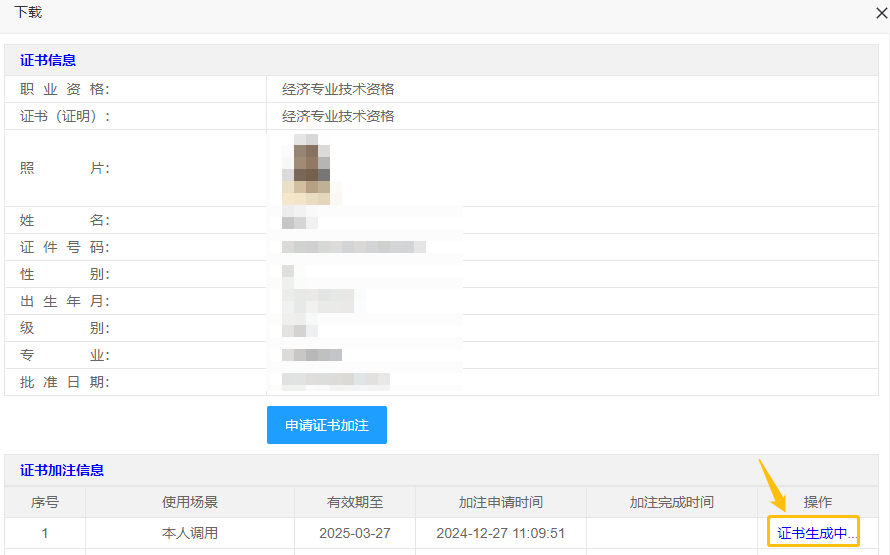 点击【下载】按钮,进入电子证书加注、下载页面。
