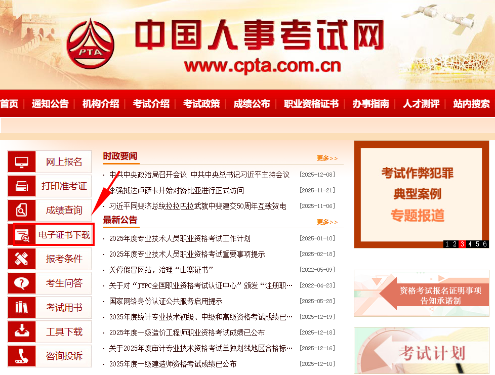 访问中国人事考试网首页,点击左侧菜单中的【电子证书下载】。