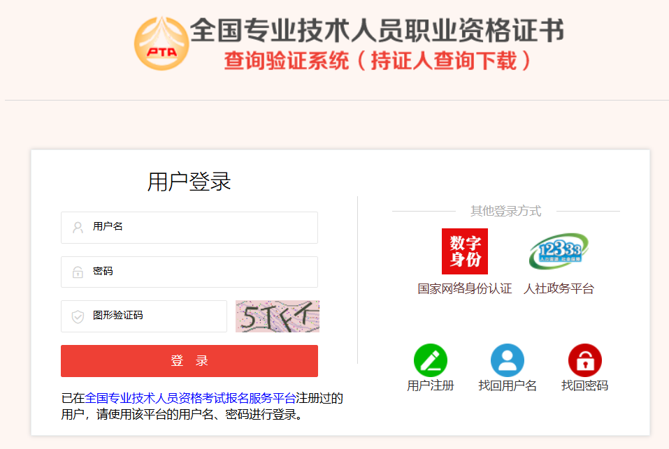 已在中国人事考试网“全国专业技术人员资格考试报名服务平台”注册过的持证人员,请直接使用该平台的用户名、密码进行登录。