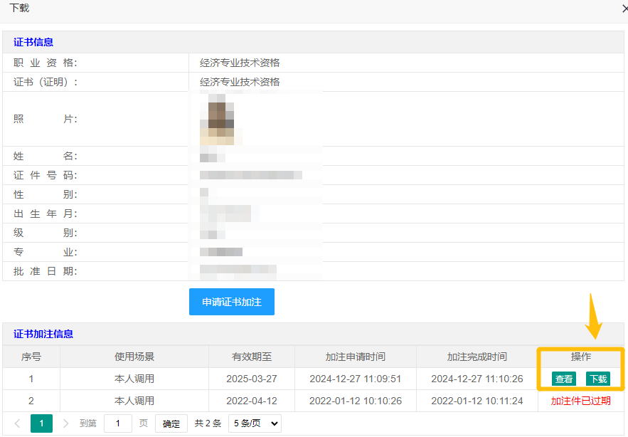 已完成加注,且加注处于有效期内的电子证书,可点击[查看]或[下载]按钮,进行电子证书查看、下载操作。