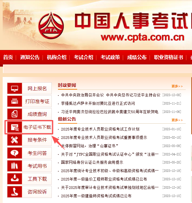 ①打开中国人事考试网,点击左侧【电子证书下载】