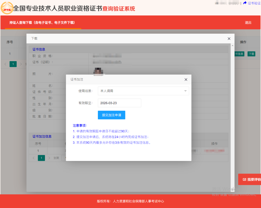 ⑥点击【申请证书加注】,选择使用场景(目前支持“本人调用”)和加注有效期(最长90天,无特殊需求建议选上限,减少重复操作),确认后点击【提交加注申请】。