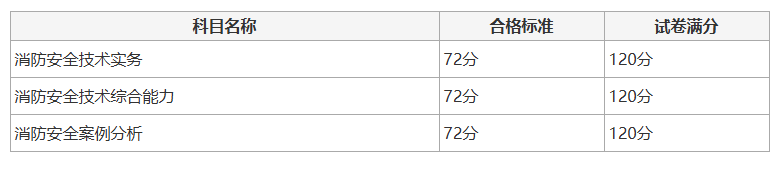 根据中国人事考试网发布的《关于部分专业技术人员职业资格考试合格标准有关事项的通告》,明确了一级注册消防工程师考试各科目合格标准为试卷满分的60%,“消防安全技术实务”“消防安全技术综合能力”和“消防安全案例分析”三个科目合格标准均为72分(试卷满分为120分)。