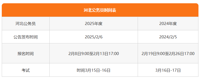 河北省2026年度公务员报名时间暂未公布,根据近两年考试时间来看,2026年度公务员报名公告将在2月初发布,报名时间将在2月中旬进行,以下是近两年河北公务员报考时间统计表,供大家参考: