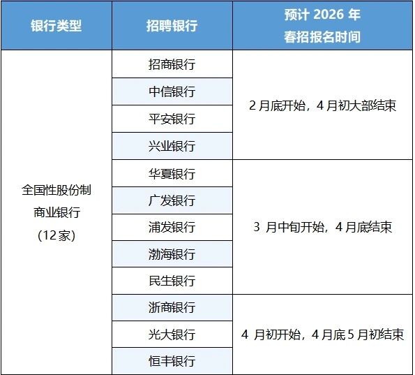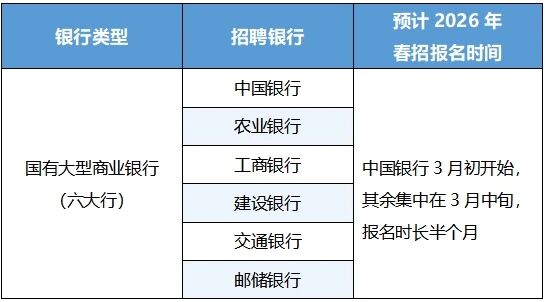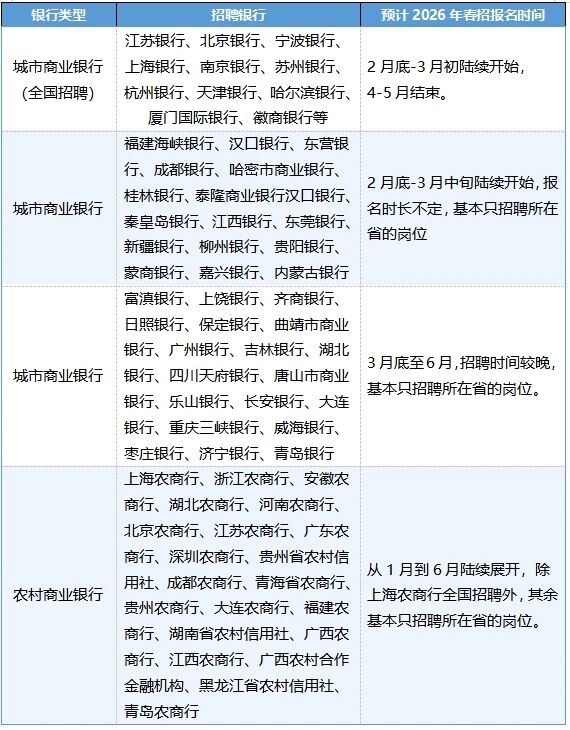 通过对100+家银行历年招聘规律进行整理分析,2026年春招时间已清晰可循:今年国有六大行、股份制银行、城商行/农商行的春招将在2月底逐渐启动。