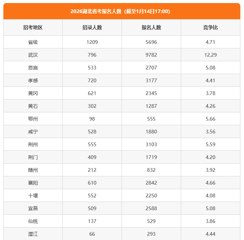 截至1月14日17:00,2026年湖北省公务员考试报名人数达到42428人,较往年有所增长,各地区的报考情况如下: