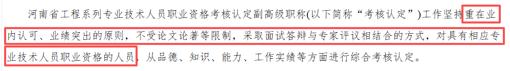 河南省工程系列专业技术人员职业资格考核认定副高级职称(以下简称“考核认定”)工作坚持重在业内认可、业绩突出的原则,不受论文论著等限制,采取面试答辩与专家评议相结合的方式,对具有相应专业技术人员职业资格的人员,从品德、知识、能力、工作实绩等方面进行综合考核认定。