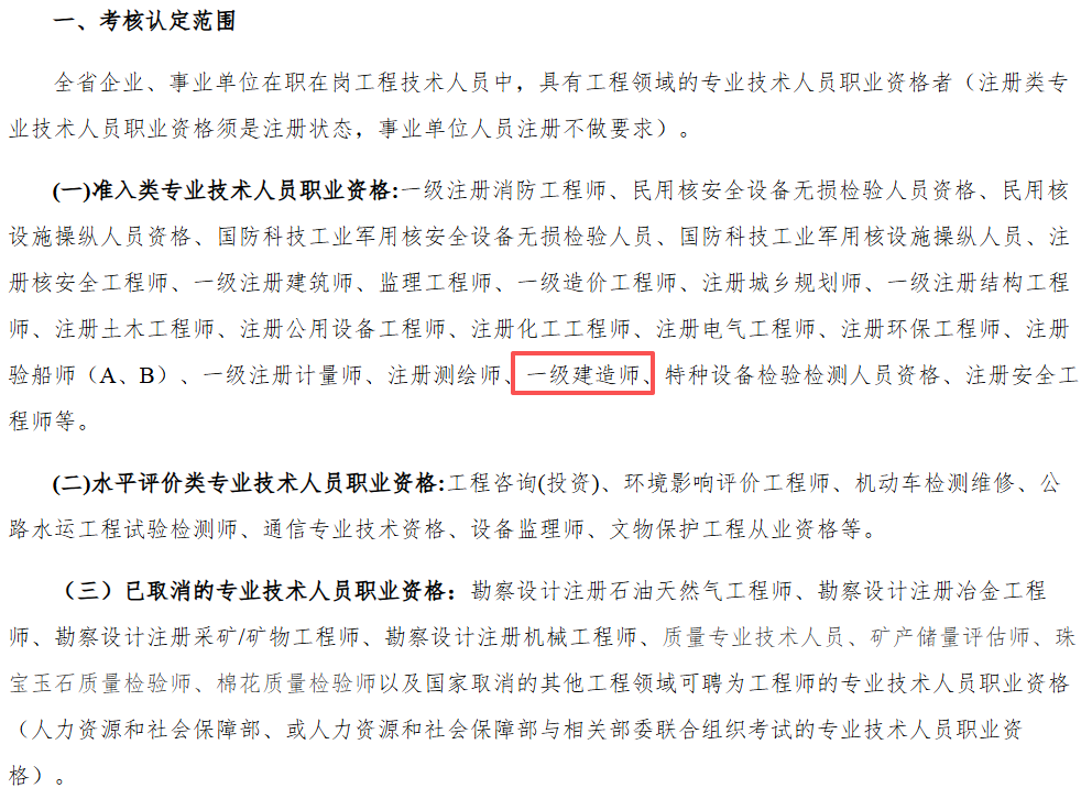 考核认定范围:全省企业、事业单位在职在岗工程技术人员中,具有工程领域的专业技术人员职业资格者(注册类专业技术人员职业资格须是注册状态,事业单位人员注册不做要求)。包括中级注册安全工程师。